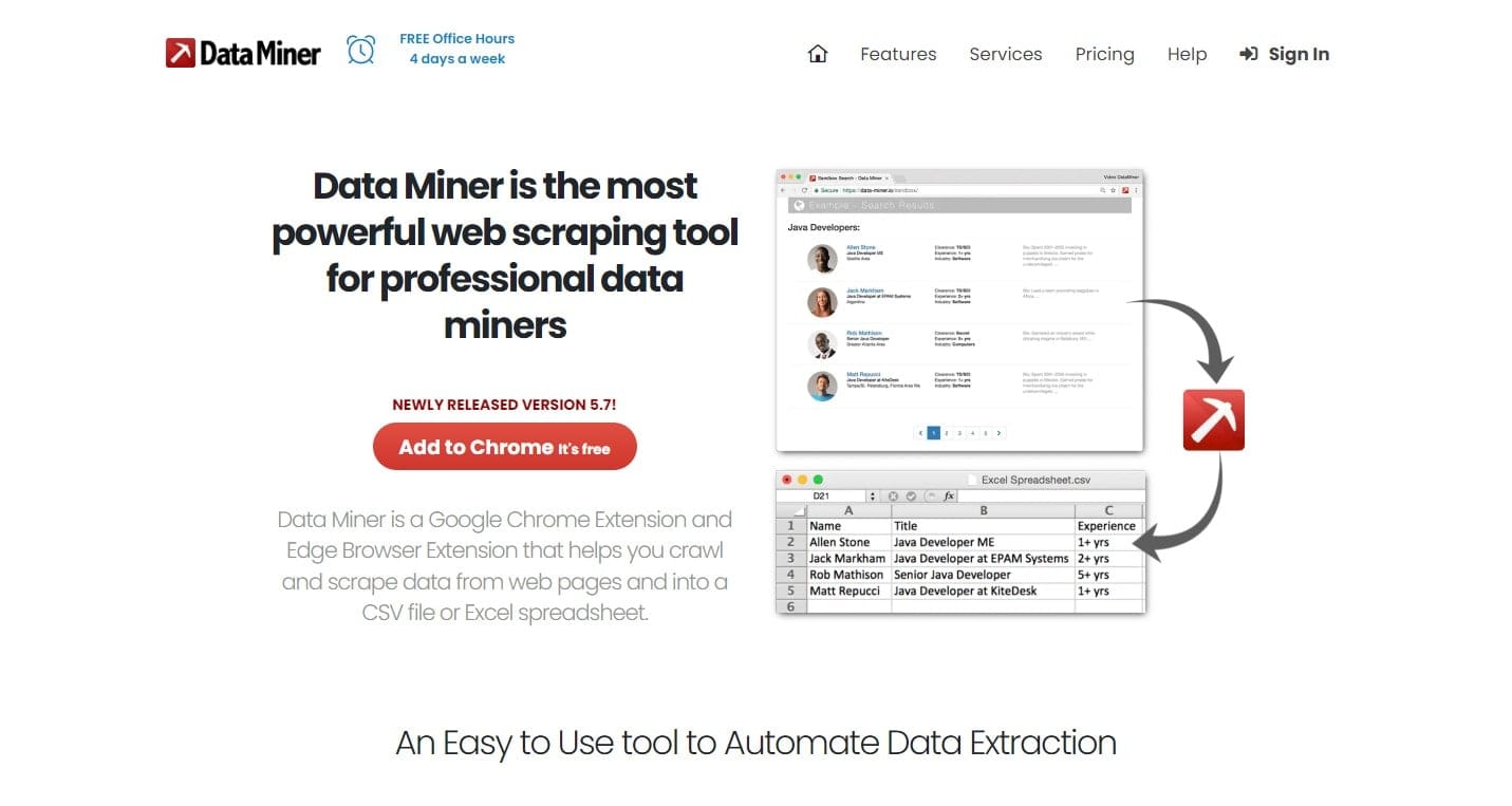 DataMiner is a browser extension that permits the extraction of data directly from websites, job boards included, without requiring codes. It is great for those looking for a quick and lightweight tool. Perfect for pulling out job titles, companies, and locations with just a few clicks.
