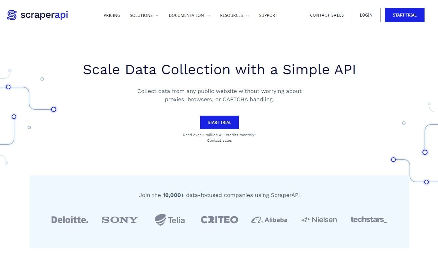 ScraperAPI provides easy, fast data extraction from websites, integrates proxies and CAPTCHAs, and provides raw HTML data with minimal hassle. It works seamlessly with Python, PHP, and Java, among other programming languages, making it a darling for developers.