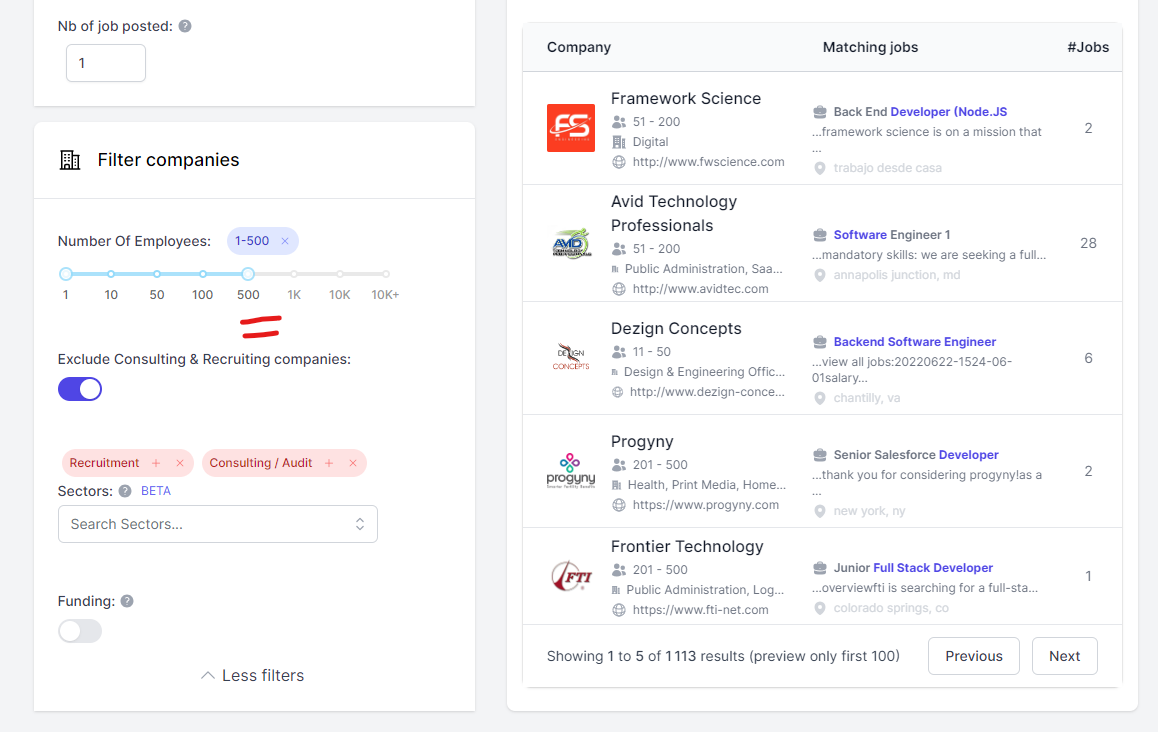 This automatically exclude recruitment agencies and consulting firms to have a list with only companies recruiting for themselves.
