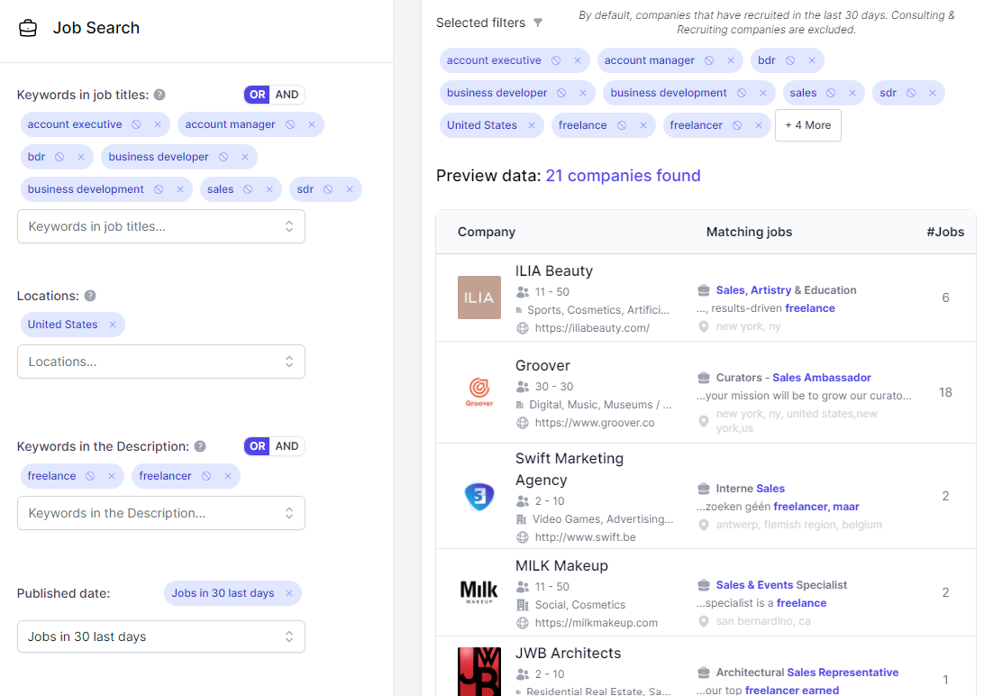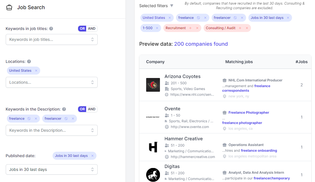 On the screen below, we target companies who post a job where we find "Freelance" in the job description.