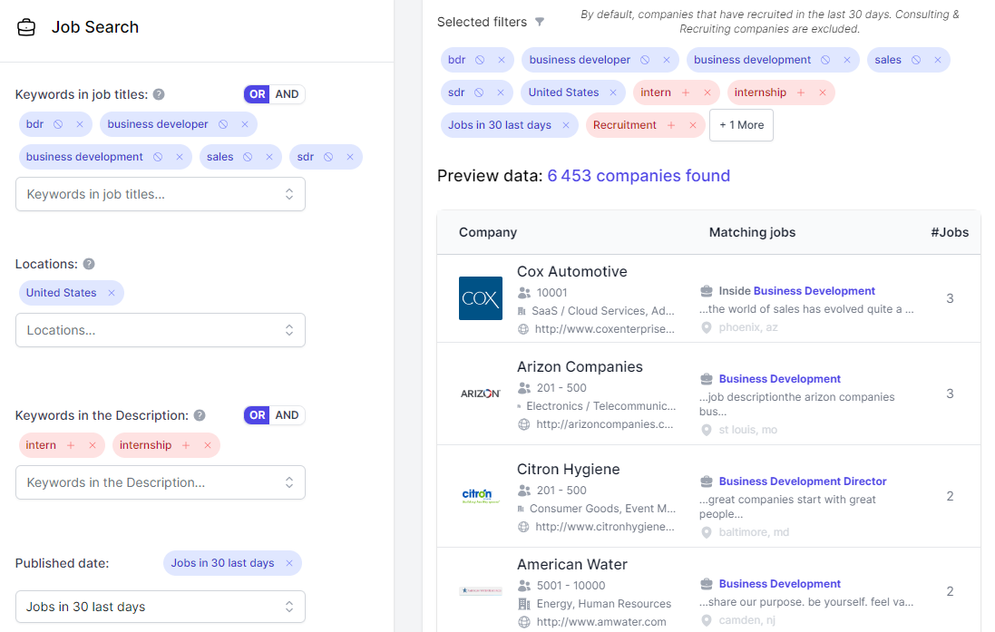 - Sales development agency: identify companies with a sales development needs to find new missions for your consultants.