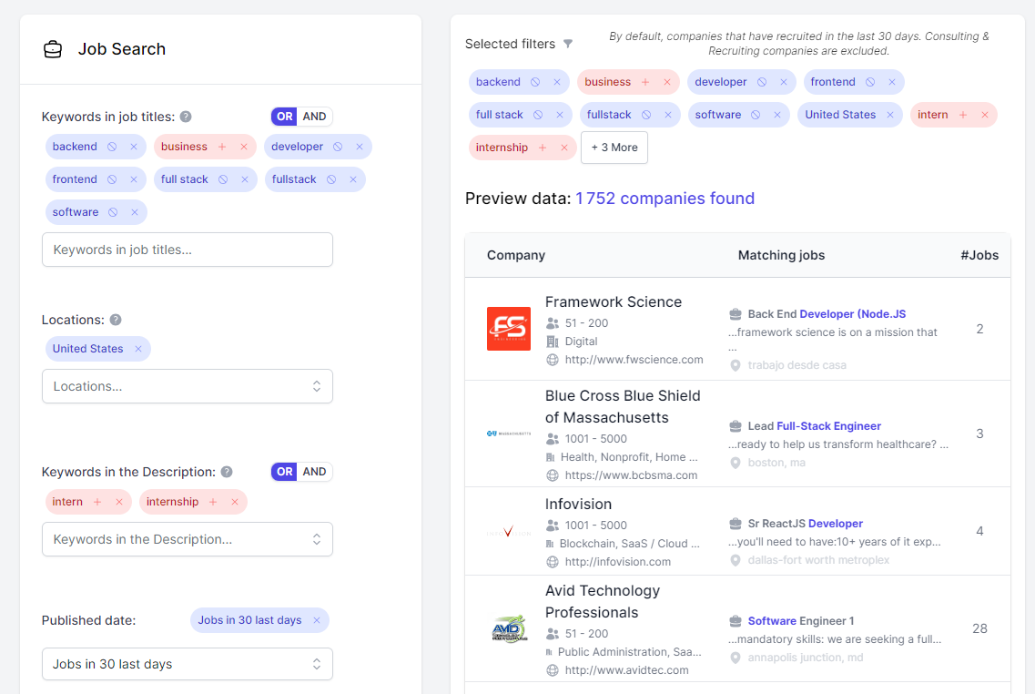 Finally, we have filtered results on job postings published in the last 30 days to have only the freshest offers still open.