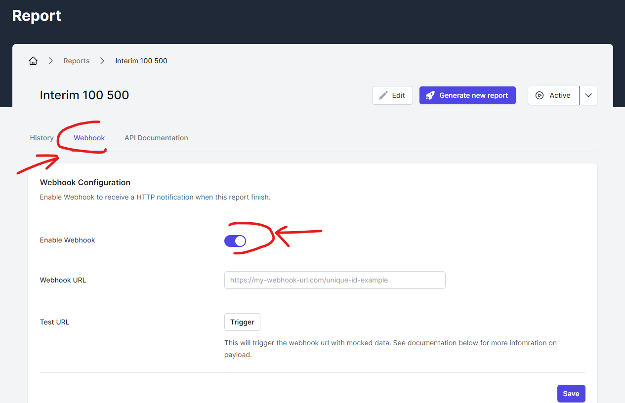 To enable the webhook, go to report page and click on menu "webhook" then enable it.