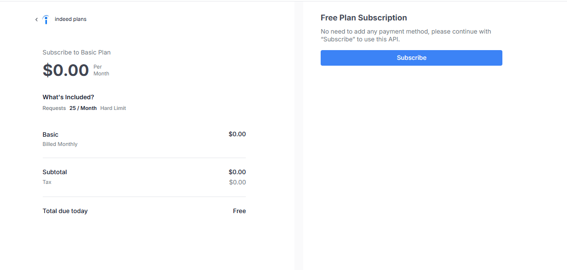 - Subscribe to the API: by clicking Subscribe after logging in to the API page and select the free plan.