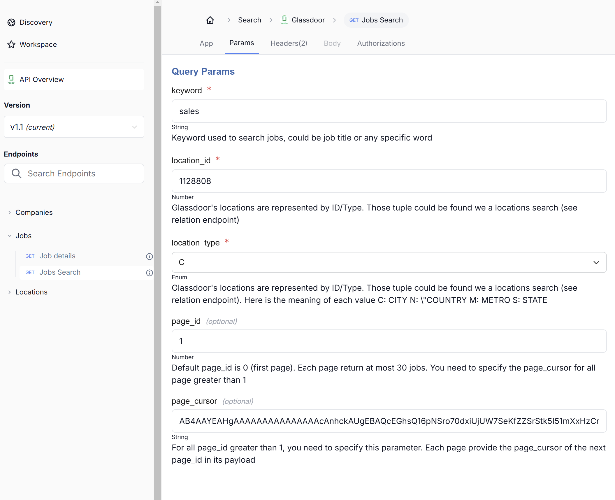 Once you have the API key, you are good to go for setting up parameters to begin searching with the Glassdoor scraper.